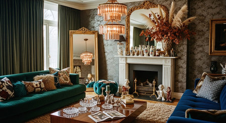 Living room decor, home interior design . Bohemian Glam style with Gallery Wall decorated with Velvet and Gold material . Generative AI AIG26.