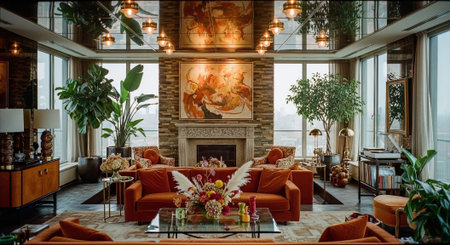 A luxurious living room with large windows, featuring orange sofas, a fireplace, and decorative plants