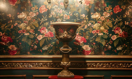 Velvet-covered pedestal with golden trim, vintage floral wallpaper backdrop