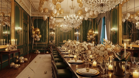 An opulent dining room is shown, featuring a long table set for a formal gathering. The space is decorated with gold and white balloons, and illuminated by multiple chandeliers. The walls are adorned with ornate paneling and mirrors. This imagery is suitable for commercial uses related to events and celebrations.