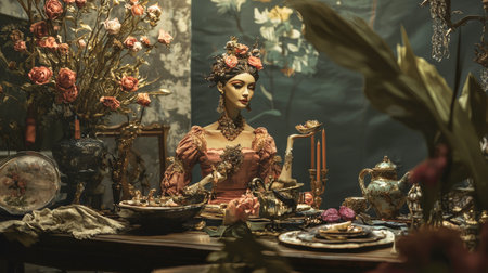 An opulent dining table adorned with ornate decor, fresh flowers, and vintage elements, creating a luxurious and dramatic ambiance.