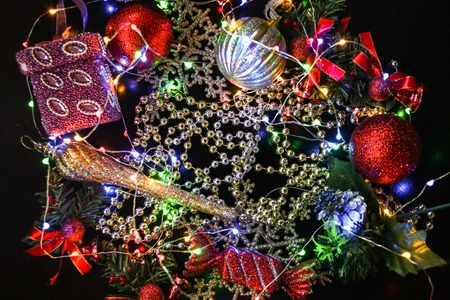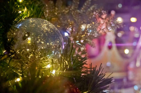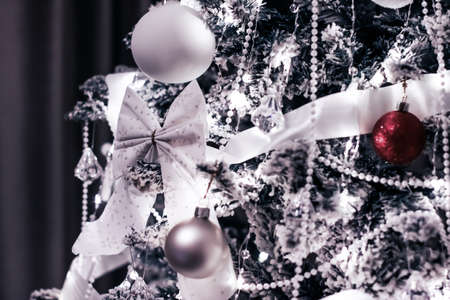 Christmas and New Year background. Festive decorations on the background of a Christmas tree.