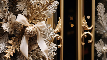 Christmas decoration details on English styled luxury high street city store door or shopping window display, holiday sale and shop decor inspiration