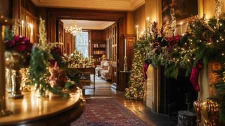 Cozy hotel interior glowing with warm festive lights creating a soft holiday mood.