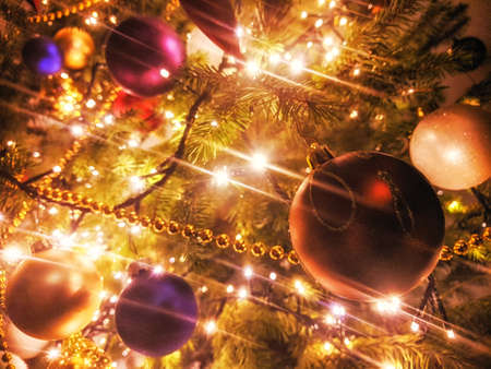 Close up branch of christmas tree with colorful balls and toys. New Year background. Winter backdrop