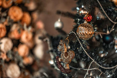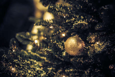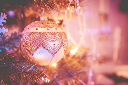 Closeup of Christmas tree decorations. Selective focus with retro faded colors
