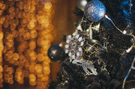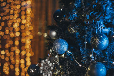 Christmas tree decorated with beautiful blue balls and toys. Beautiful bokeh