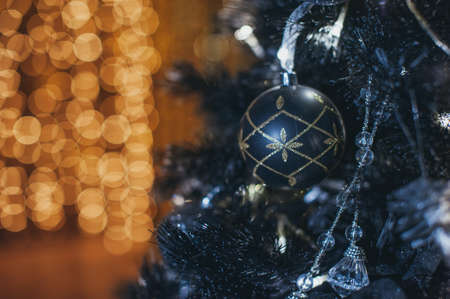 Festive Christmas tree toys and the lights. 2022 holiday concept