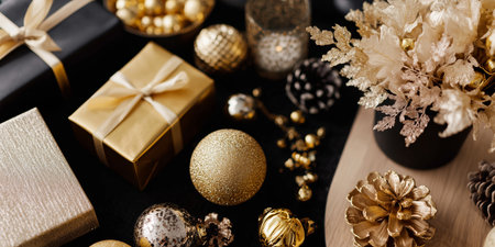 Gifts and decorations in gold tones for a festive celebration in a stylish setting