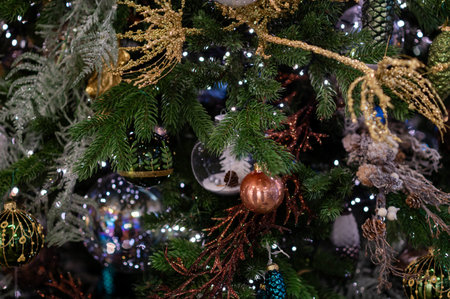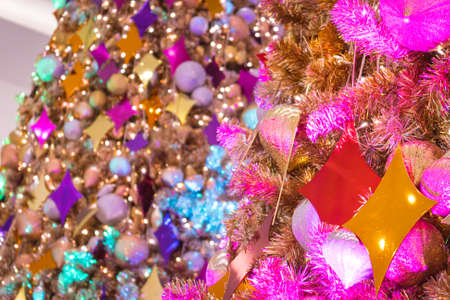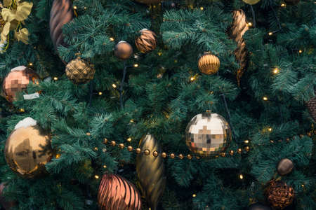 Christmas tree with many beautiful ornaments background. Winter holidays concept.