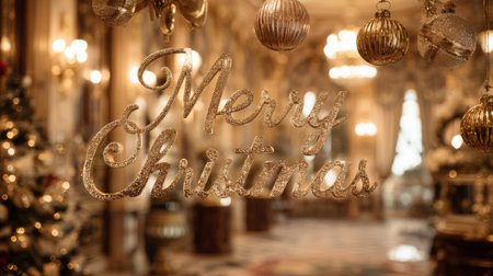 Stunning interior setting adorned with a golden Merry Christmas sign, evoking warmth and joy during the festive season in an elegant environment.