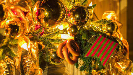 Details decorated Christmas tree with golden star balls, garland. Outdoor fair. Xmas card and pattern. Close up.