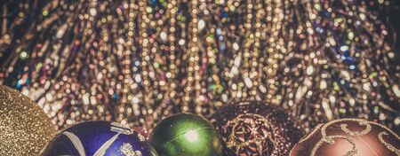 Many colorful balls for Christmas tree with shiny tinsel. Panorama of Christmas toys of different sizes and colors with design.