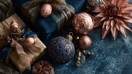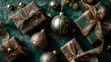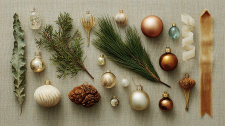 A beautifully arranged collection of Christmas ornaments, natural foliage, and decorative elements on a textured background, ideal for seasonal design projects and holiday themes.