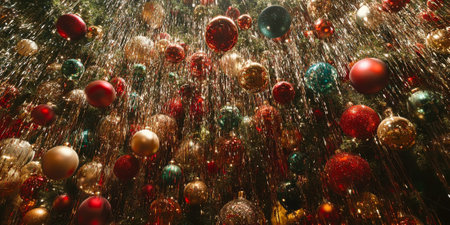 Glittering tinsel and ornaments cascading down from a Christmas tree, capturing the holiday spirit