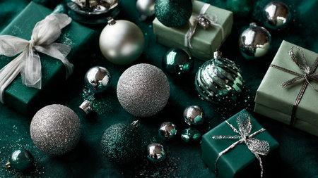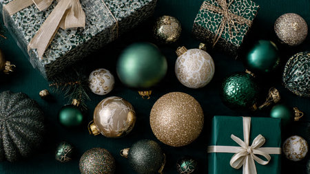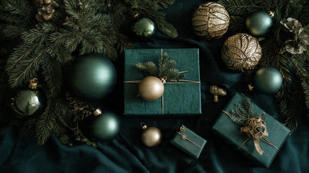 Soft-lit festive mockup combining subtle gold hues with deep emerald shadows.
