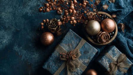 A premium Christmas mockup featuring monochrome blue textures and refined rose-gold ornaments.