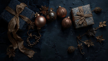 A top view of luxurious gift packages in gold and black, adorned with elaborate bows, nestled among elegant tree trimmings and crystal ornaments. The overall look is festive and opulent.