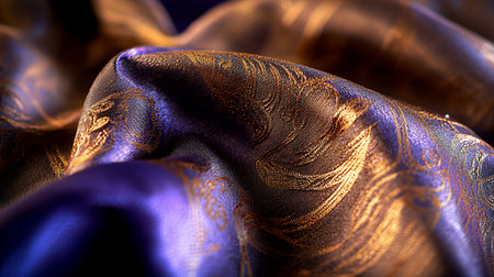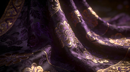 Sophisticated digital artwork evoking opulent evening luxury through intricate brocade textures, metallic threads, and dramatic spotlight effects in deep purple and gold tones. Ideal for high-end fashion textiles, premium upholstery, elegant packaging, and sophisticated branding visuals. Versatile for commercial design in luxury industries and editorial layout... AI-generated digital illustration. AI-generated illustration.