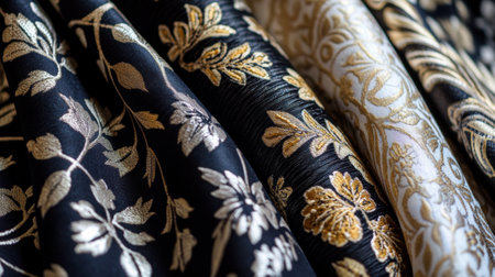 Close-up of layered fabric samples, featuring rich textures and elegant woven designs