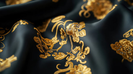 This stunning close-up image captures a luxurious black fabric adorned with intricate gold embroidery, showcasing delicate floral patterns. Perfect for fashion and design projects.