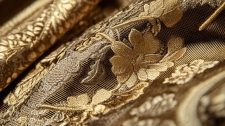 This close-up image features intricate golden embroidery on fabric, showcasing delicate floral patterns and artistic textures, perfect for luxury designs.