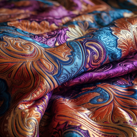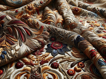 This captivating image showcases an elegant silk fabric adorned with intricate embroidery, featuring rich colors and textures ideal for fashion or textile design.