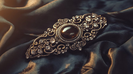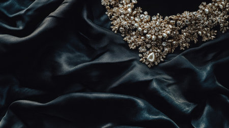 This stunning jewelry piece showcases intricate design features and luxurious detailing, beautifully resting on rich black satin fabric. Perfect for fashion photography.