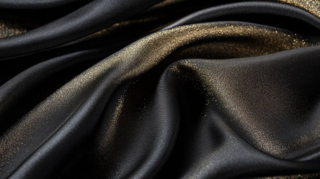 This close-up image showcases a luxurious black satin fabric adorned with a stunning golden shimmer. The smooth texture and elegant drape create a captivating visual appeal, making it perfect for fashion and interior design projects.