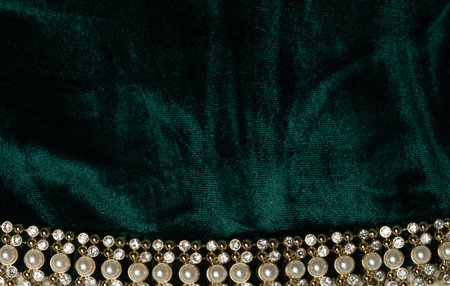 Soft green velvet features a sparkling trim of pearls and crystals, creating a luxurious and stylish appearance for fashion designs.