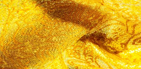 Texture background, pattern. fabric; yellow gold brocade. Organza brocade fabric - shepherd, with a crunchy palm. It has a large yarn-dyed flower embroidered pattern throughout.