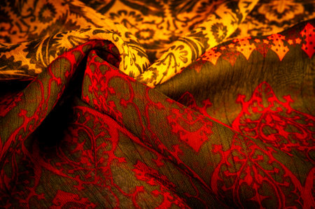 Background texture, drawing. Silk fabric. Fabric with bright patterns of yellow and red colors, Indian fabric, silk fabric around the yard, printed silk, printed fabric Sanganery