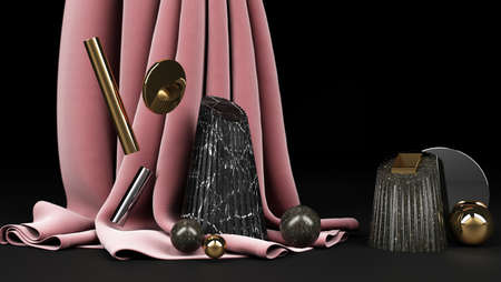 Geometric object Black with black and gold marble material and clear glass With a stand for product display Pink cloth backdrop and black background 3d rendering