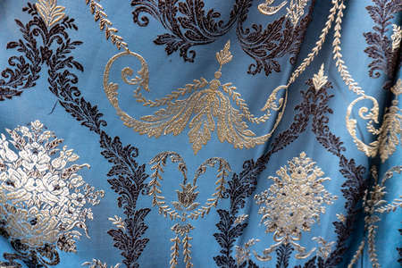 Close-up of French brocade, luxurious fabric with raised gold patterns on a rich, royal blue background.