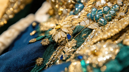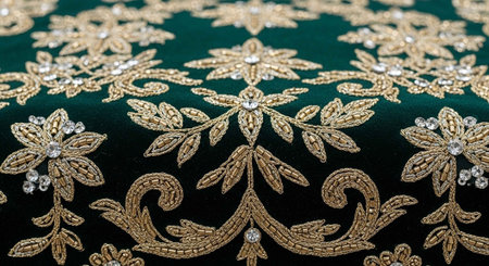 A captivating close-up showcasing exquisite embroidery featuring intricate designs adorned with beads and sequins on vibrant fabric, highlighting craftsmanship.