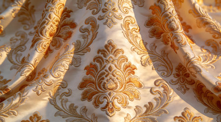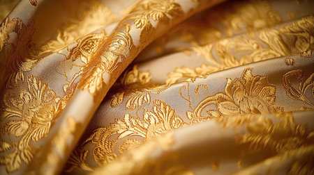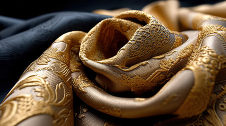 Close-up of luxurious golden fabric showcasing intricate embroidery and a rich texture, perfect for fashion, decor, or artistic projects.