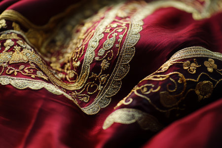 Close-up of intricate Indian sari embroidery, golden threads on rich silk.
