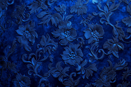 A shimmering velvet jacquard fabric texture background in deep royal blue. The intricate, embossed floral designs add a touch of luxury and depth, ideal for opulent home furnishings and evening gowns.