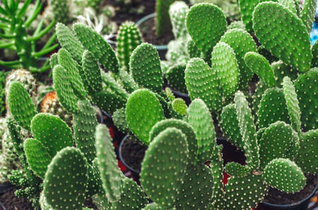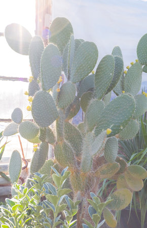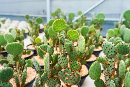 cacti in the greenhouse, the cultivation of cacti, rare cactus plants with flowers. FILN effect and shallow focus