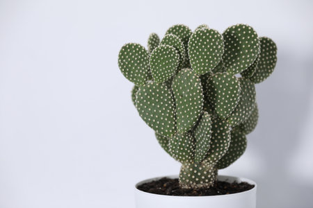 Beautiful prickly pear cactus in pot on light background, closeup. Space for text