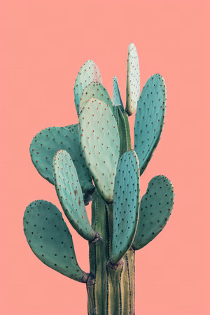 green Prickly Pear Cactus on orange background, creative pop art style with pastel shades, copy space for text
