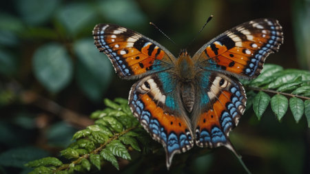 A vibrant butterfly with intricate wing patterns gently perched on coarse, lush foliage, evoking a peaceful, nature-inspired scene perfect for spring