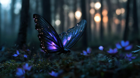 A majestic butterfly with iridescent wings rests delicately on flowers in a dark forest as twilight casts a magical glow. Soft light filters through the trees, enhancing the scene.