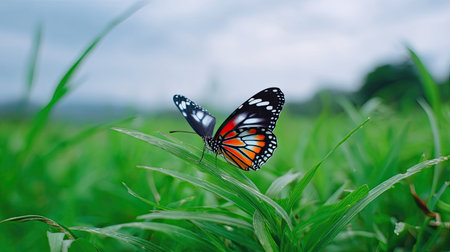 A stunning butterfly rests elegantly on lush green grass, showcasing intricate wing patterns and vibrant colors. This serene scene captures the essence of nature's beauty.