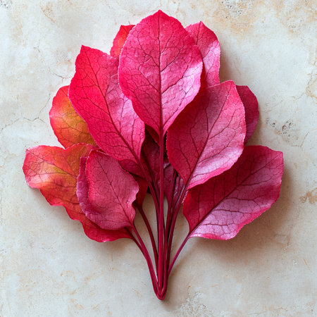 Overhead shot captures fresh purple basil, showcasing vibrant shades on a textured stone background. Details are visible in each leaf's rich colors and veins, accentuating the natural beauty.