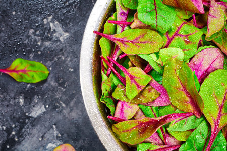 Ingredients for vegetable salad. Fresh organic raw leaves of lettuce beets on a dark background. Selective focus
