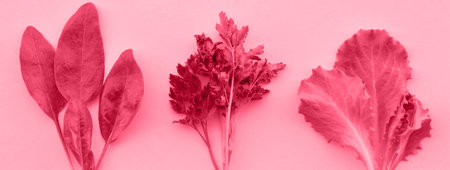 Variety of green vegetables spinach, parsley, lettuce on a beige background. top view. Healthy food concept, vegan, diet, healthy skin, raw diet bio organic Tinted image, color of the year 2023 viva magenta