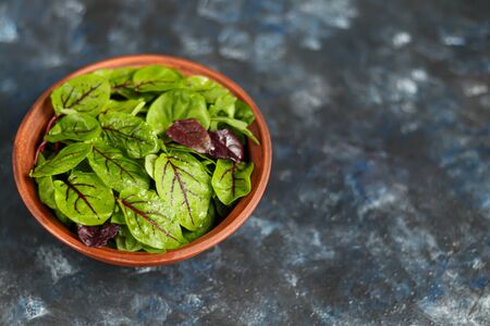 A mixture of green young lettuce, spinach, arugula and young beetroot. Healthy diet. Vegetarian breakfast. On a dark background. Copy space.