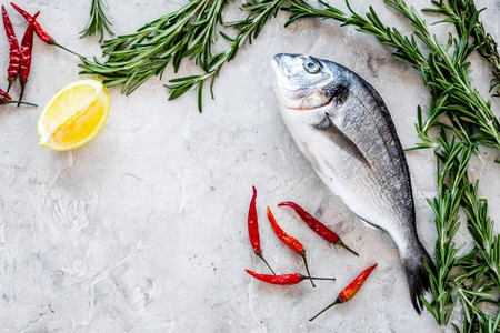 Fresh fish dorado. Dorado and ingredients for cooking on a concrete background.