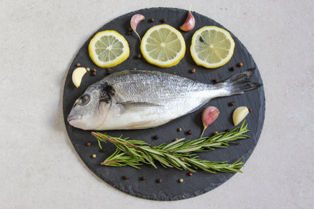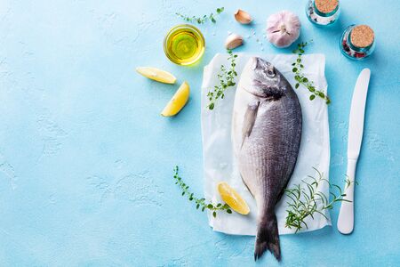 Still life of ingredients for cooking fresh Sparus aurata
